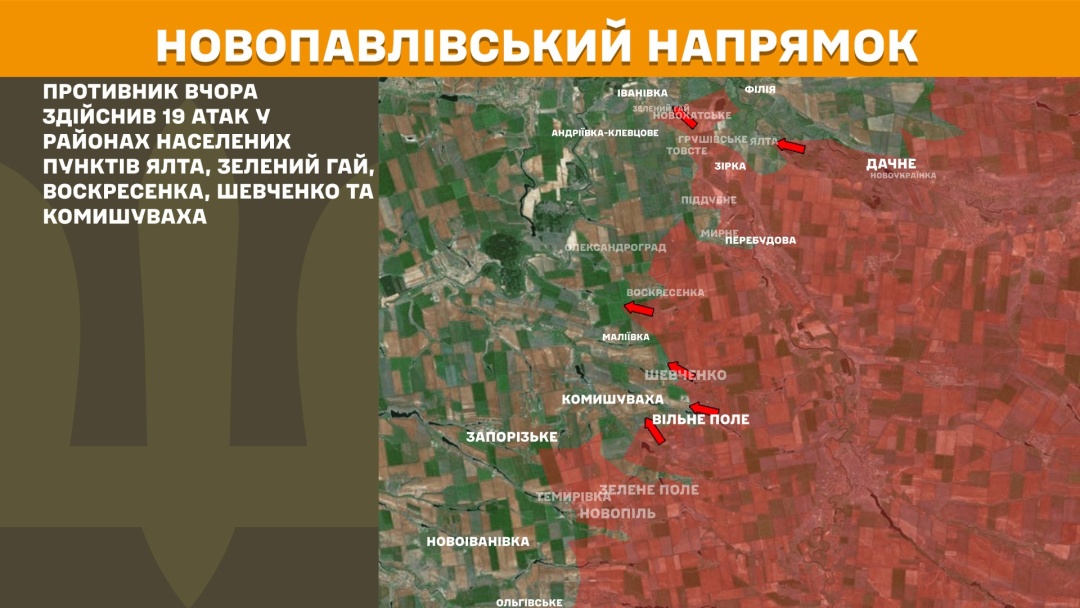 На Новопавлівському напрямку противник учора здійснив 19 атак у районах населених пунктів Ялта, Зелений Гай, Воскресенка, Шевченко та Комишуваха.