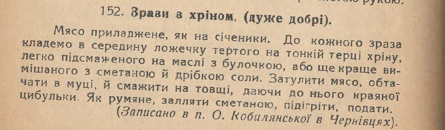«Вона розуміла свій обов’язок – наготувати й нагодувати родину. Адже спершу мешкала з батьками, потім з названою донькою та її дітьми. Принцип ведення господарства у Кобилянської – ощадливість. Їжа має бути доступною та смачною. Готувала багато різного, надто якщо це стосувалося десертів: пляцочки, завиванці, торти, печиво», – каже Юлія Микосянчик.