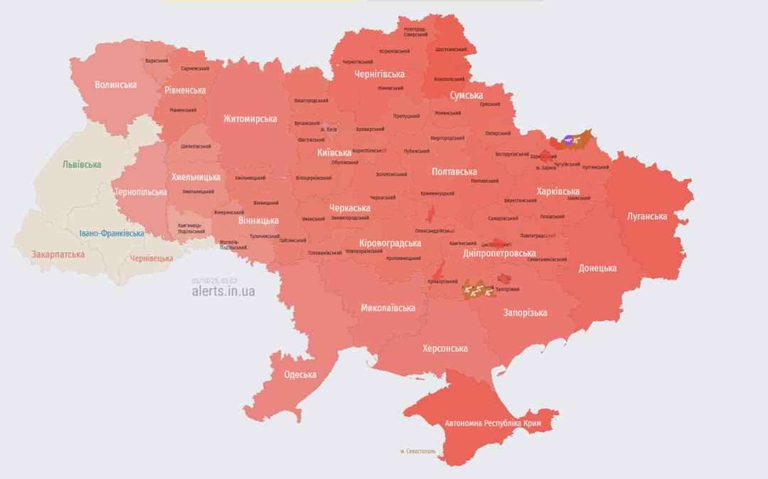 03:03 – масована атака дронів дісталася західних областей, повідомляє Укрінформ з посиланням на мапу повітряних тривог.
