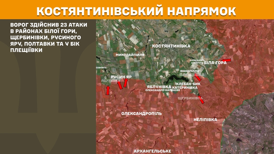 На Костянтинівському напрямку росіяни здійснили 23 атаки в районах Білої Гори, Щербинівки, Русиного Яру та Полтавки, у бік Плещіївки.