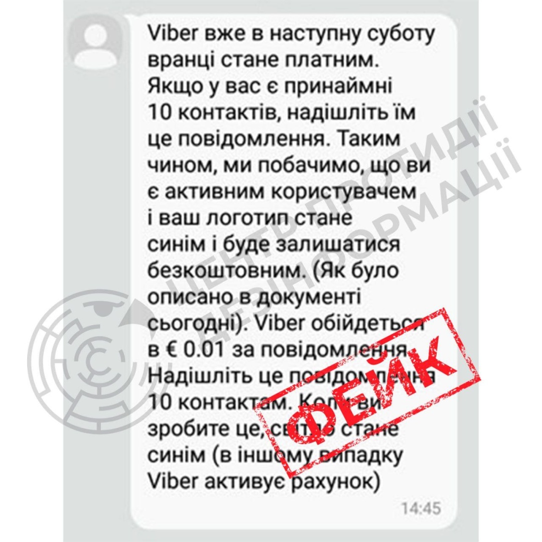 «Користувачі месенджера отримують повідомлення, що «вже наступної суботи Viber стане платним». У тексті закликають «переслати це повідомлення 10 контактам, щоб месенджер залишився безкоштовним», і додають, після цього «логотип стане синім». Це старий фейк, який циркулює у мережі щонайменше з 2018 року. Його текст неодноразово «оживав» у нових хвилях розсилок. У повідомленні немає жодних конкретних дат, офіційного джерела чи підтвердження від компанії Viber. Фрази, як «наступної суботи» без вказування дати, присутні у повідомленні для імітації актуальності», – йдеться в повідомленні.