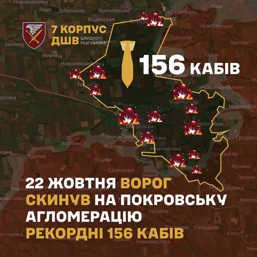 "Ворог стирає авіабомбами Покровську агломерацію. Вчора, 22 жовтня, у смузі відповідальності 7 корпусу ШР ДШВ росіяни завдали тактичною авіацією рекордні 39 ударів, скинувши загалом 156 керованих авіабомб", – йдеться у повідомленні.