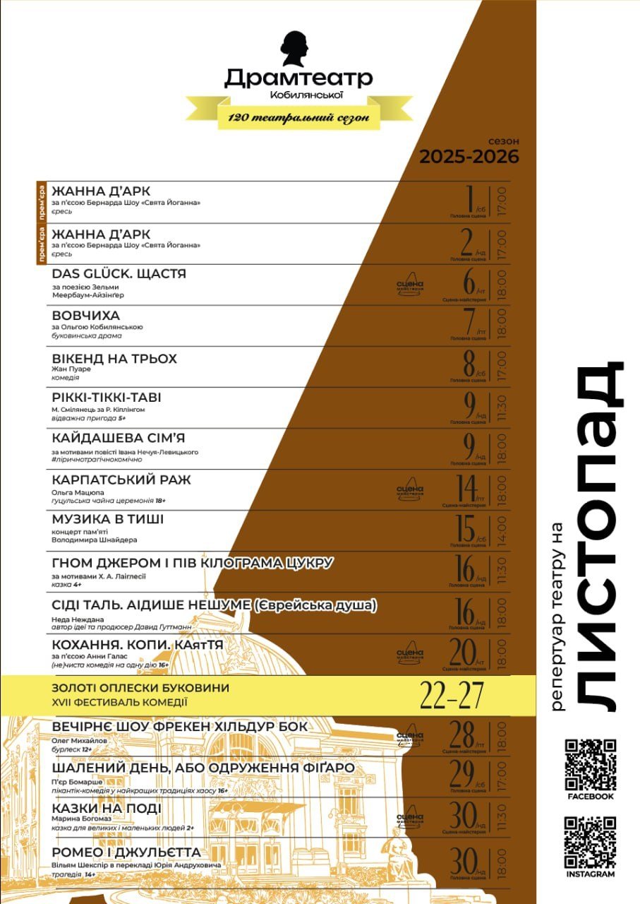 Чернівецький обласний академічний музично-драматичний театр імені Ольги Кобилянської оприлюднив афішу вистав на листопад.
