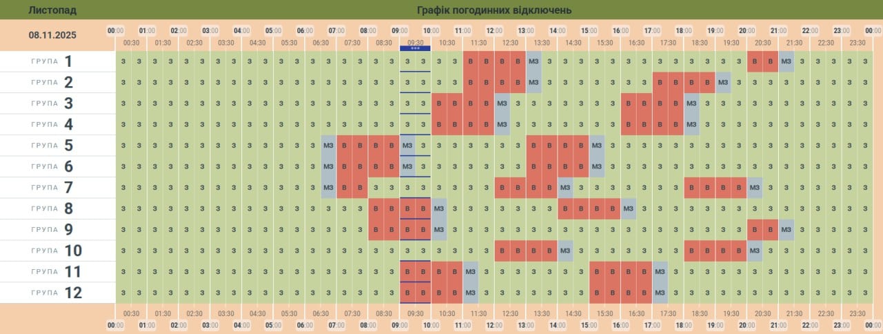 Як зазначають в обленерго, у графіку погодинних вимкнень відображаються години гарантованого ввімкнення електроенергії (зелені клітинки) та години, коли ваші оселі будуть точно знеструмлені (позначені червоним кольором).