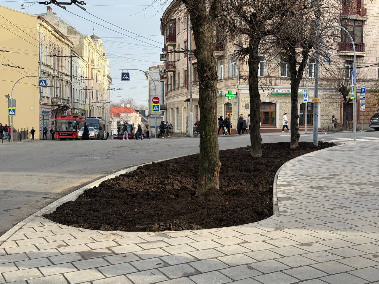 На вулиці Бандери та Університетській у Чернівцях облаштували нові тротуари та зупинки громадського транспорту, розширили зелену зону.