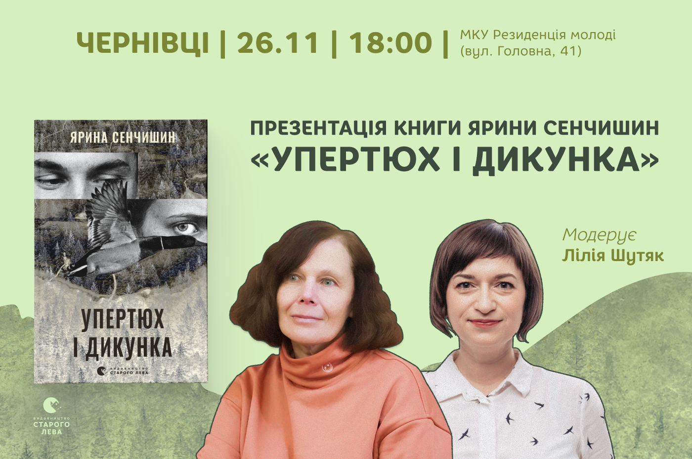 У Чернівцях, 26 листопада, відбудеться презентація дебютної прозової книги Ярини Сенчишин «Упертюх і дикунка». Подію організовує «Видавництво Старого Лева». Модераторка — Лілія Шутяк.