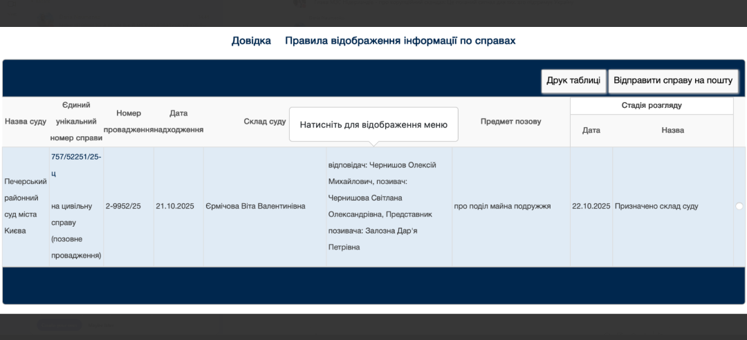Згідно з даними порталу, позов надійшов 22 жовтня 2025 року. У справі вже визначено склад суду. Єдиний унікальний номер справи 757/52251/25-ц, номер провадження 2-9952/25.