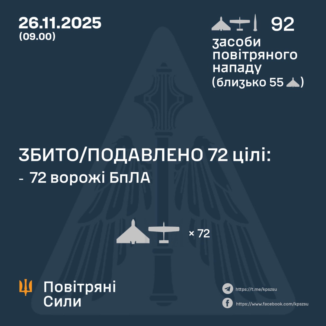 За попередніми даними, станом на 09:00 середи, 26 листопада, ППО збила / подавила 72 БПЛА на півночі, півдні та сході України.
