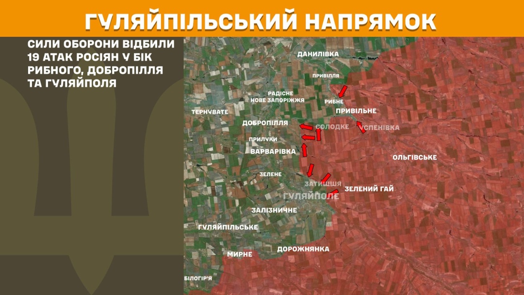 На Гуляйпільському напрямку Сили оборони відбили 19 атак росіян у бік Рибного, Добропілля та Гуляйполя.