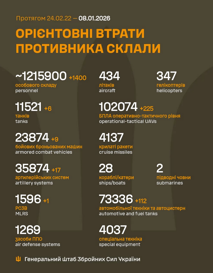 Загальні бойові втрати російських військ з 24 лютого 2022 року по 8 січня 2026 року на війні проти України становлять близько 1 215 900 осіб, зокрема 1 400 осіб – за минулу добу.