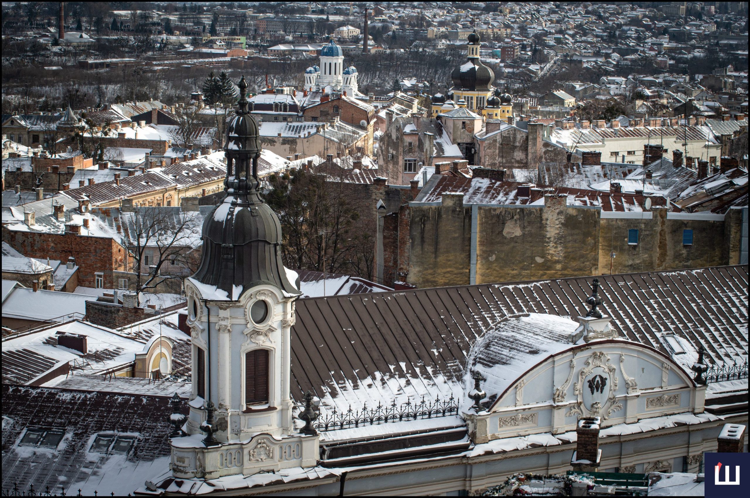 Сніг ліг на черепичні та металеві покрівлі, димарі, куполи храмів і вузькі вулиці, що добре видно з висоти.