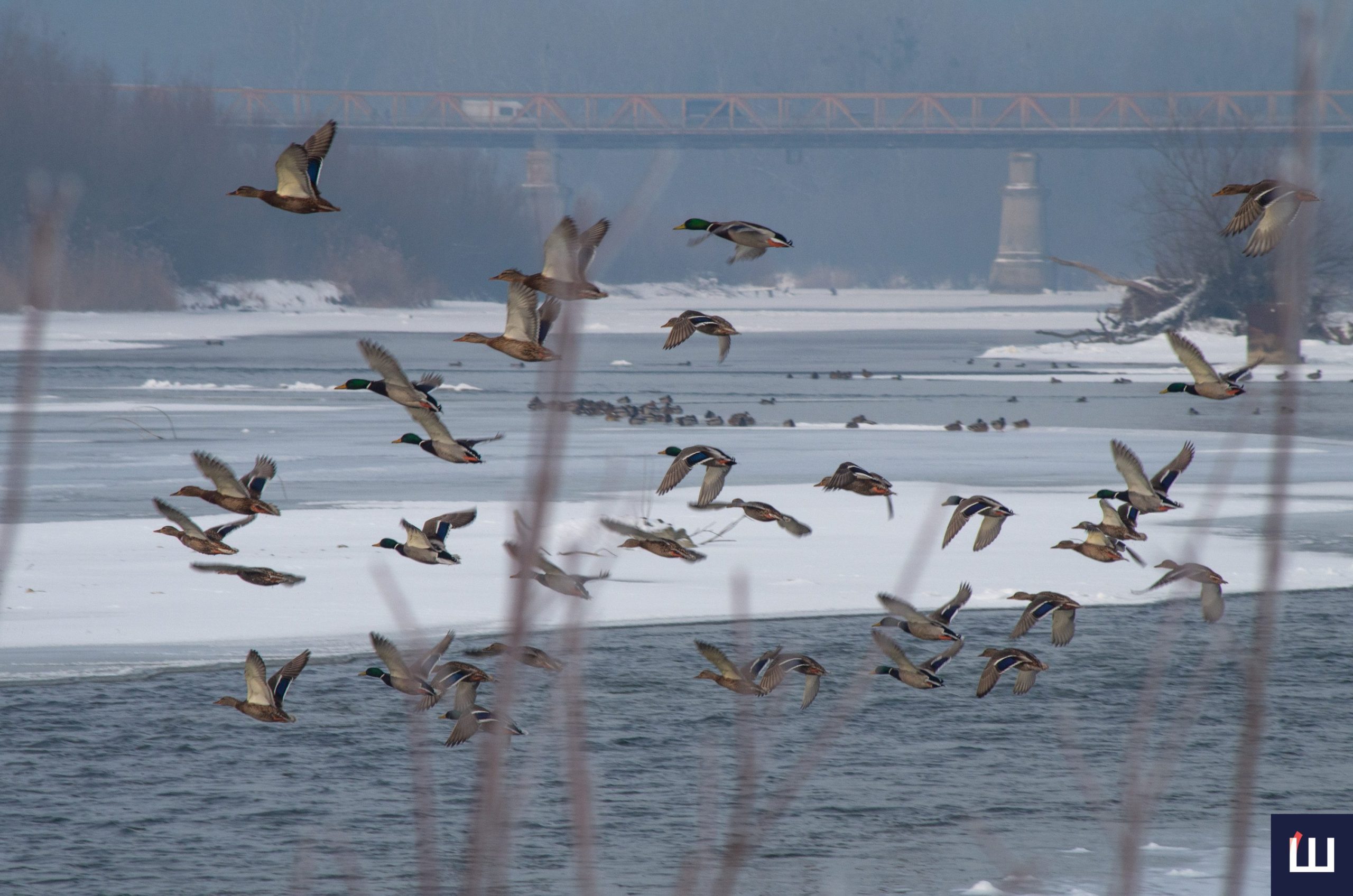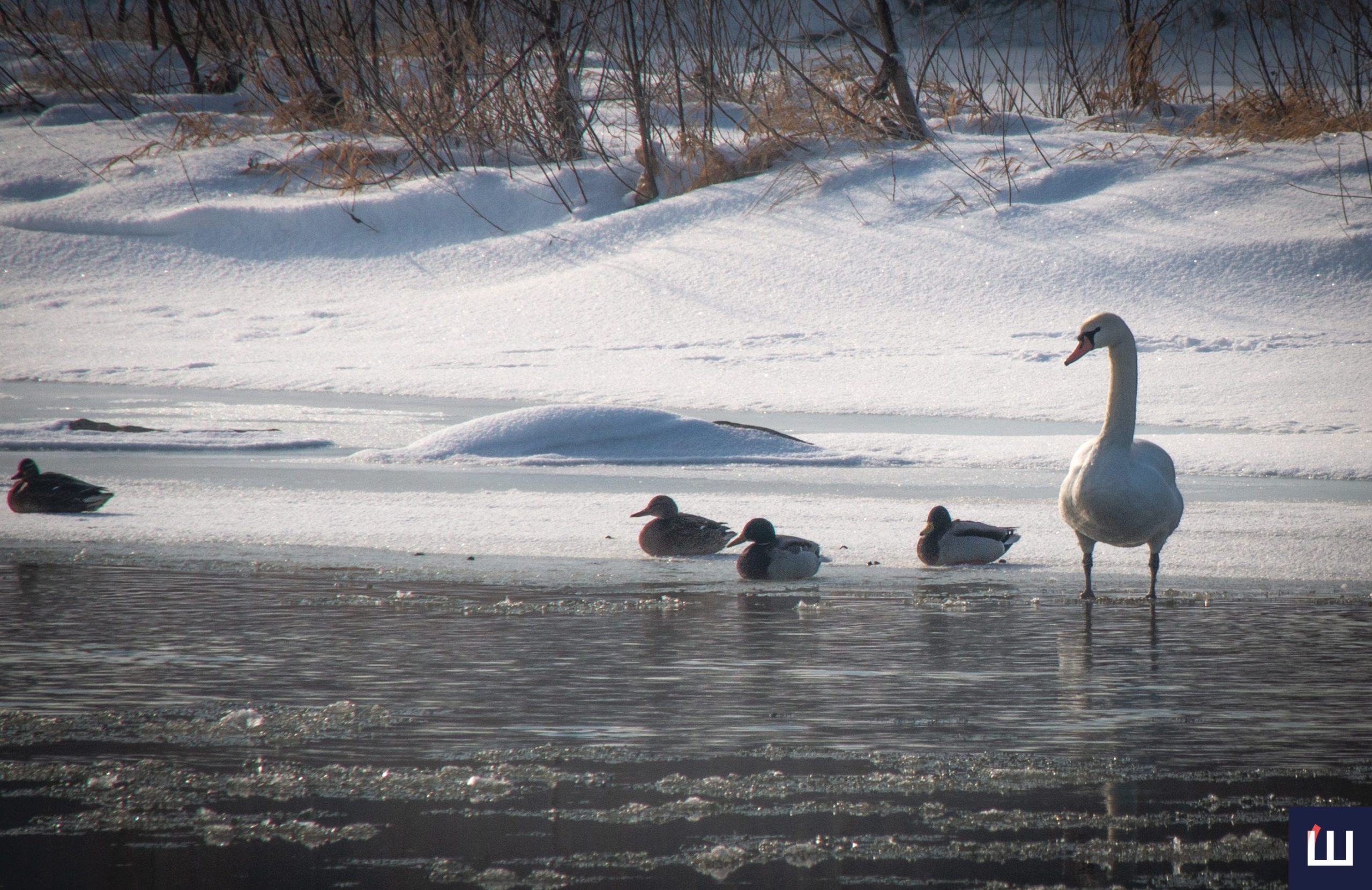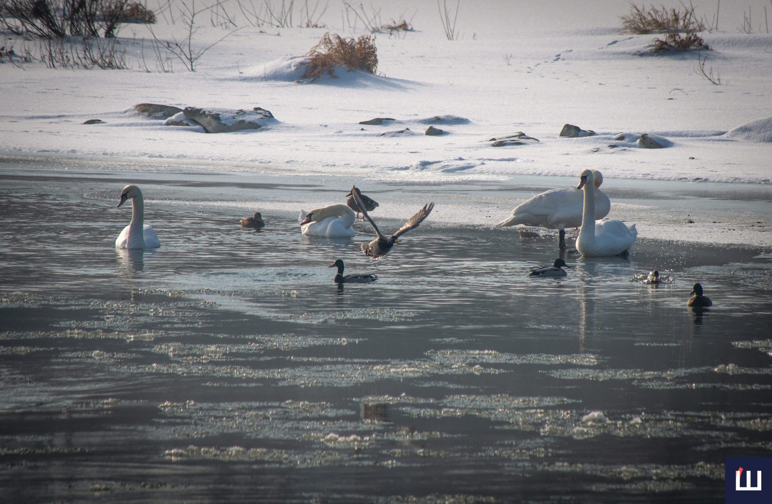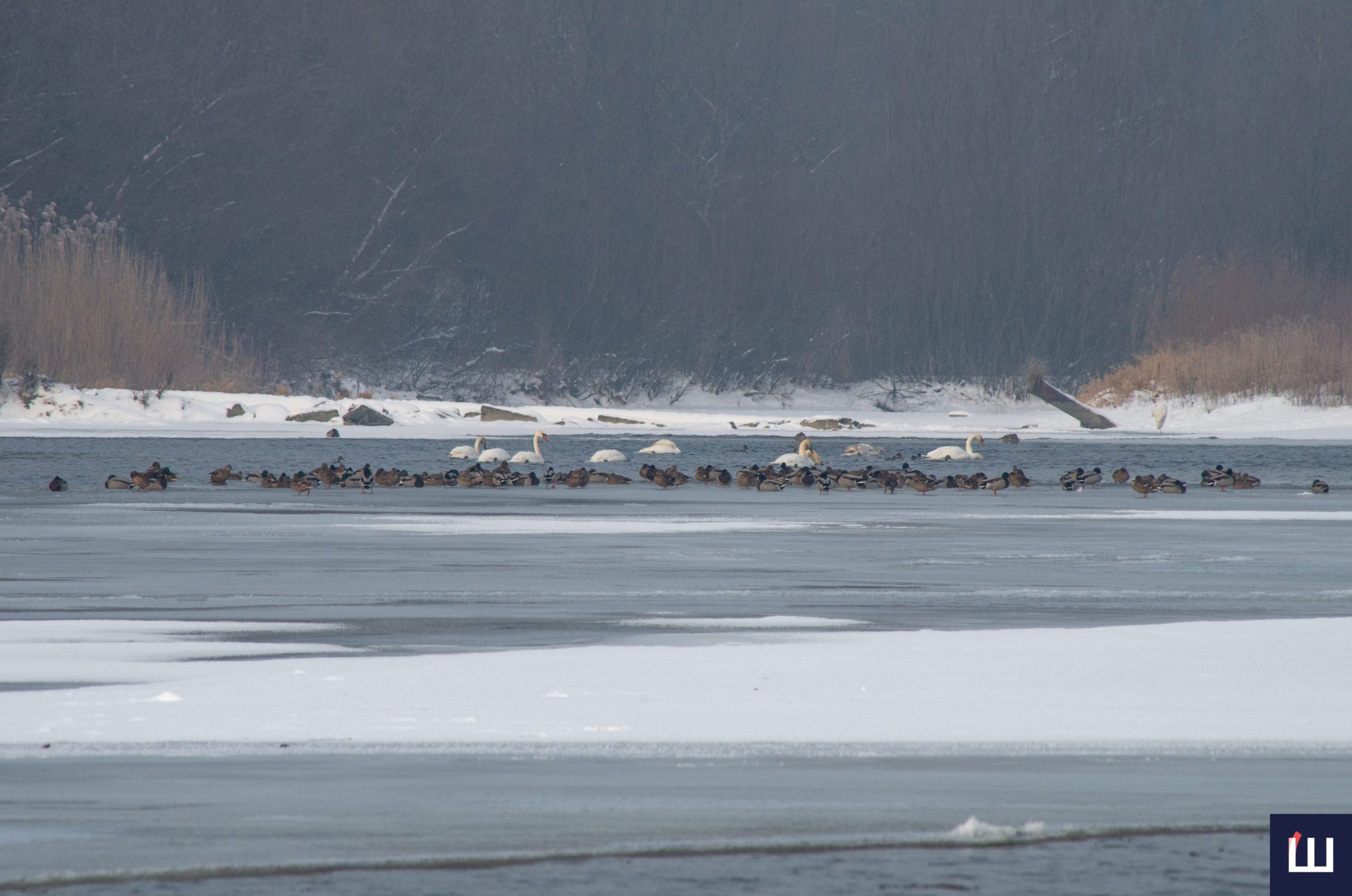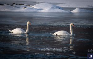 Попри сильні морози білосніжні лебеді та дикі качки залишаються на річці.