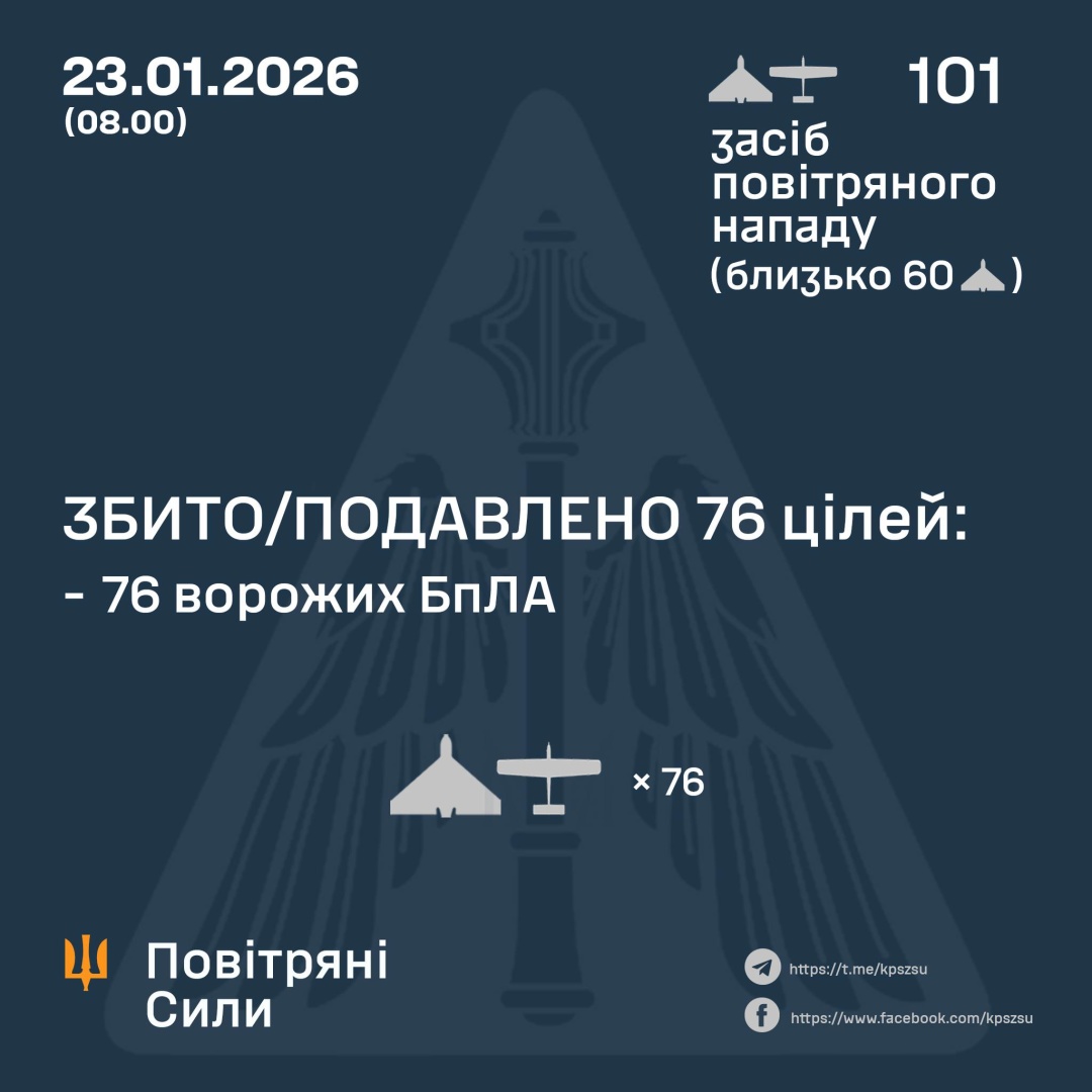 Протиповітряна оборона знешкодила 76 зі 101 безпілотника, якими росіяни атакували Україну з вечора 22 січня. Зафіксовано влучання 19 ударних БпЛА на 12 локаціях.