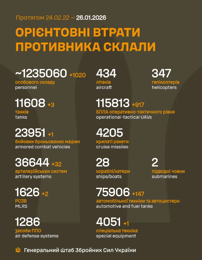 Ми зібрали для вас інформацію про тисяча чотириста тридцять третій день Великої війни: чим жили Україна та українці 26 січня 2026 року.
