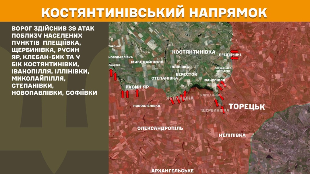 На Костянтинівському напрямку ворог здійснив 39 атак поблизу населених пунктів Плещіївка, Щербинівка, Русин Яр, Клебан-Бик та у бік Костянтинівки, Іванопілля, Іллінівки, Миколайпілля, Степанівки, Новопавлівки, Софіївки.