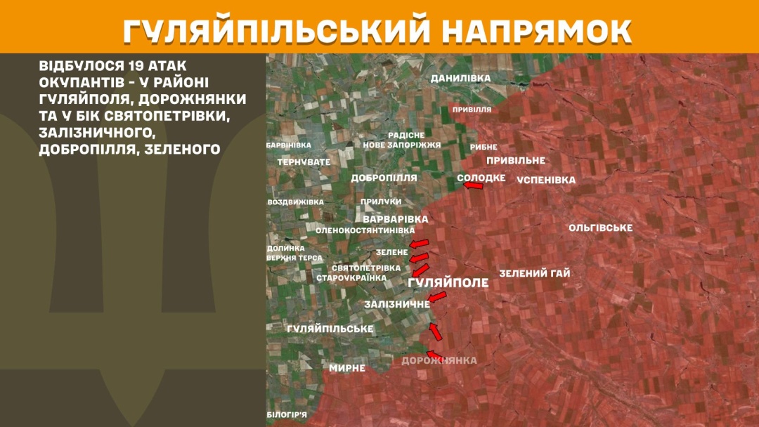 На Гуляйпільському напрямку сталося 19 російських атак у районі Гуляйполя, Дорожнянки та у бік Святопетрівки, Залізничного, Добропілля, Зеленого.