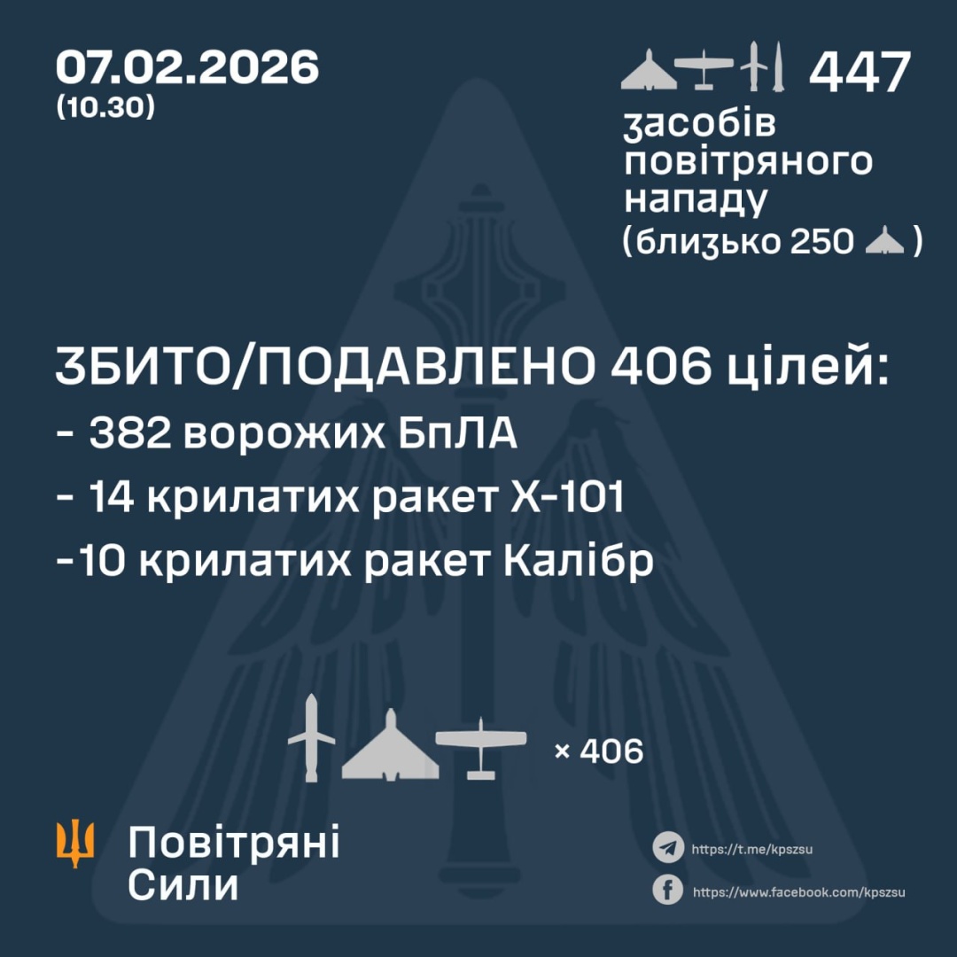 За попередніми даними, станом на 10:30 суботи, 7 лютого, ППО збила / подавила 406 цілей – 24 ракети та 382 безпілотники різних типів: