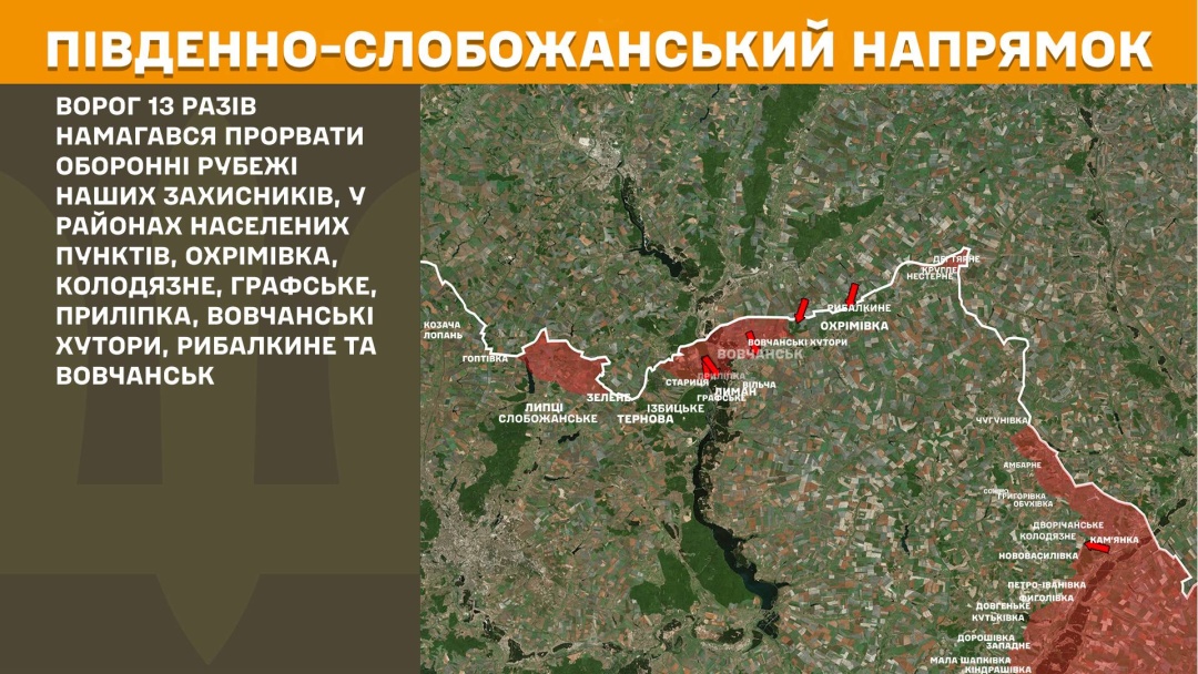 На Південно-Слобожанському напрямку ворог 13 разів намагався прорвати оборонні рубежі наших захисників, у районах населених пунктів, Охрімівка, Колодязне, Графське, Приліпка, Вовчанські Хутори, Рибалкине та Вовчанськ.
