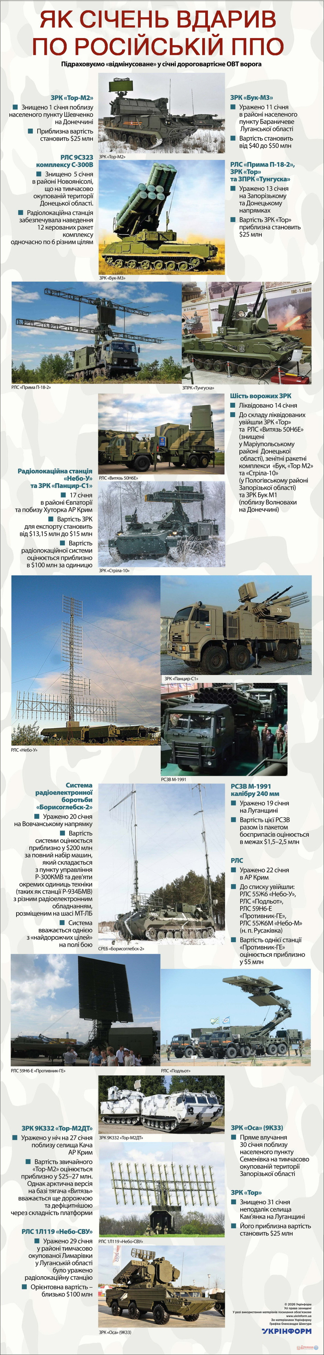 Як січень вдарив по російській ППО 16.02.2026 11:00 Укрінформ Підраховуємо «відмінусоване» у січні дороговартісне ОВТ ворога За матеріалами Укрінформу Новини з передової