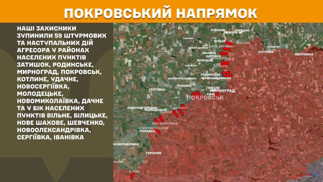 На Покровському напрямку українські захисники зупинили 59 штурмових та наступальних дій агресора у районах населених пунктів Затишок, Родинське, Мирноград, Покровськ, Котлине, Удачне, Новосергіївка, Молодецьке, Новомиколаївка, Дачне та у бік населених пунктів Вільне, Білицьке, Нове Шахове, Шевченко, Новоолександрівка, Сергіївка, Іванівка.