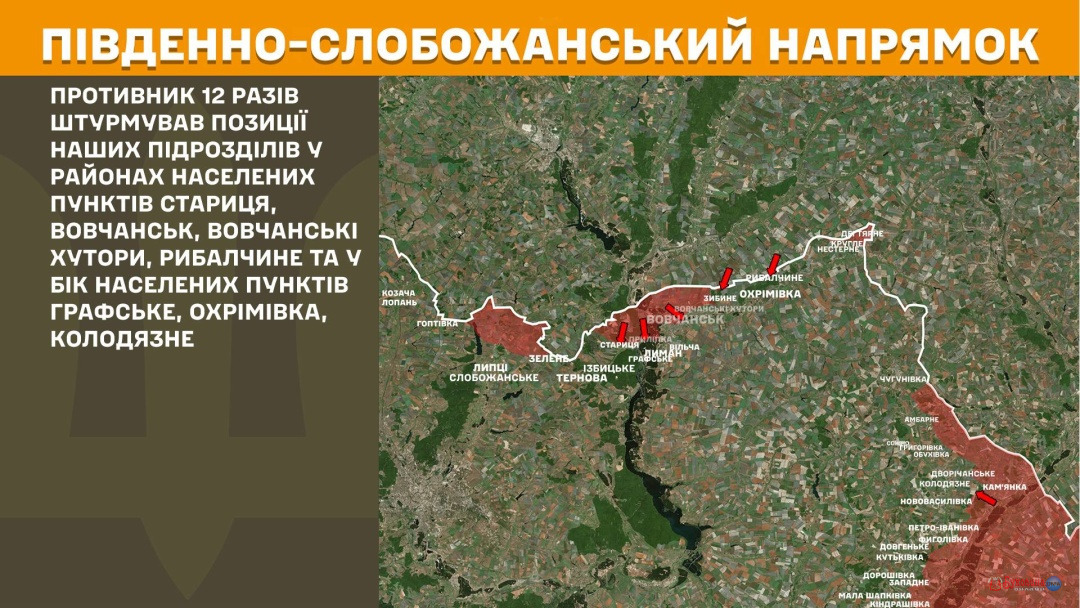 На Південно-Слобожанському напрямку ворог 12 разів штурмував позиції українських підрозділів у районах населених пунктів Стариця, Вовчанськ, Вовчанські Хутори, Рибалчине та у бік населених пунктів Графське, Охрімівка, Колодязне.