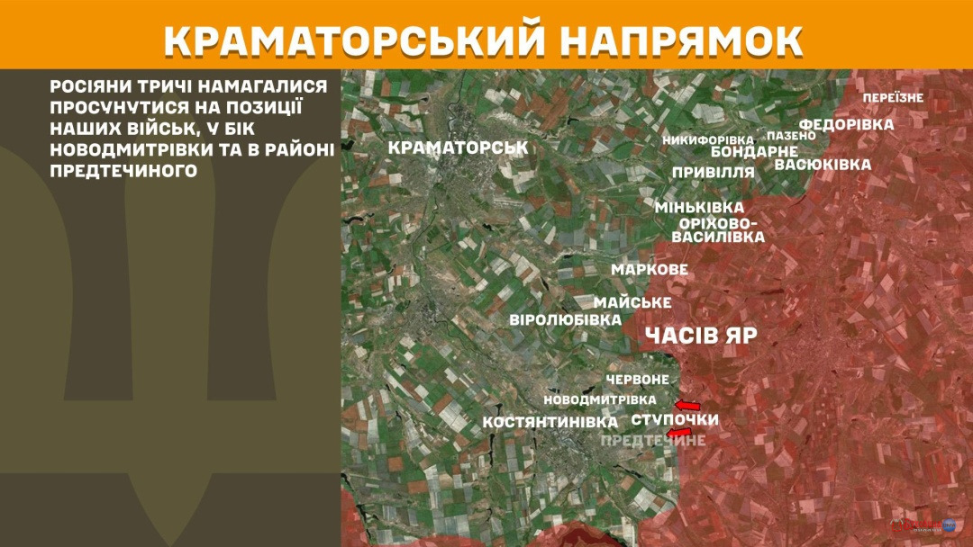 На Краматорському напрямку росіяни тричі намагалися просунутися на позиції українських військ, у бік Новодмитрівки та в районі Предтечиного.