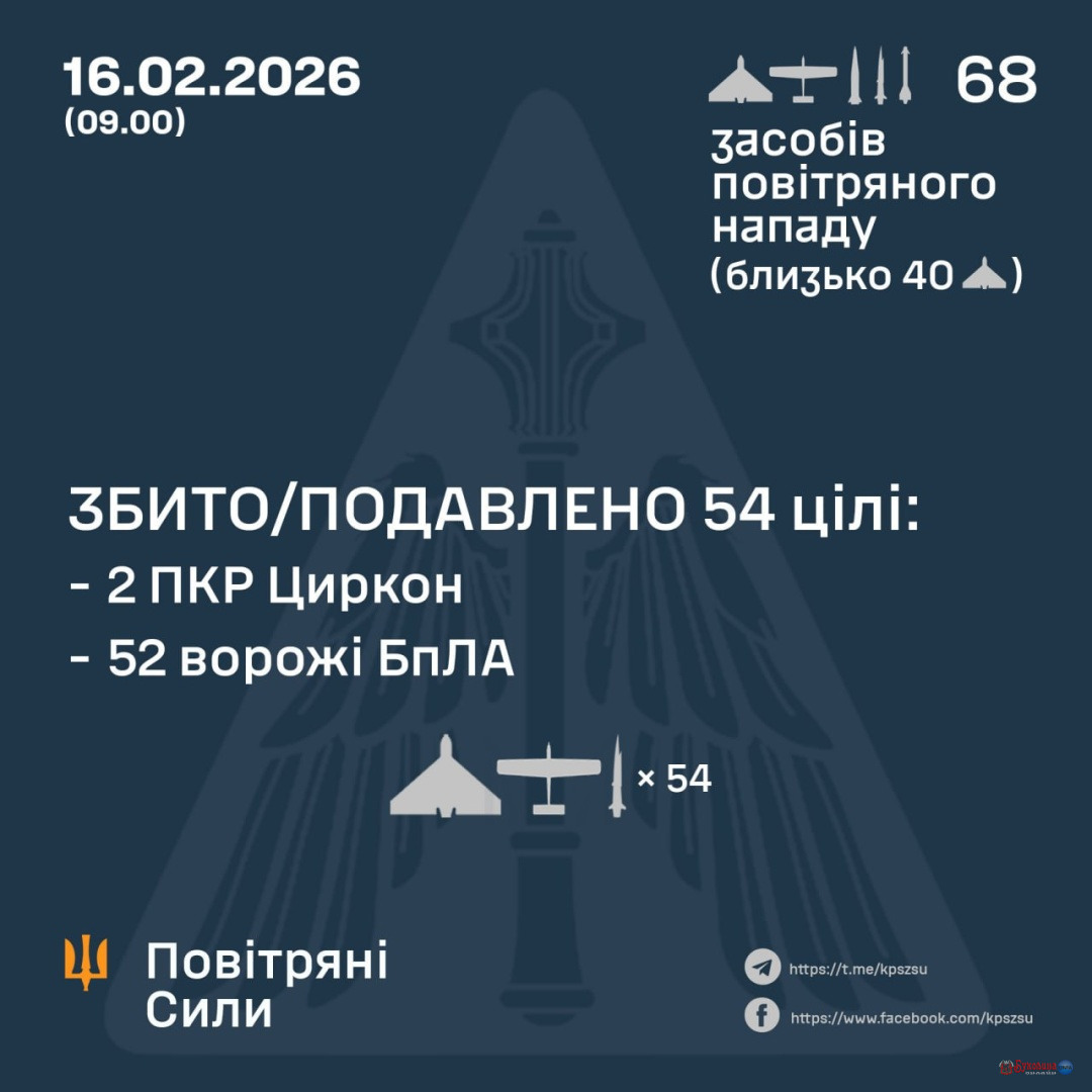 Українська ППО збила дві ракети «Циркон» та 52 ворожі дрони 16.02.2026 09:37 Укрінформ У ніч на 16 лютого Сили оборони уразили дві протикорабельні ракети Циркон та 52 ворожі БПЛА. Як передає Укрінформ, про це в Телеграмі повідомляє пресслужба командування Повітряних сил ЗСУ. «Станом  на…