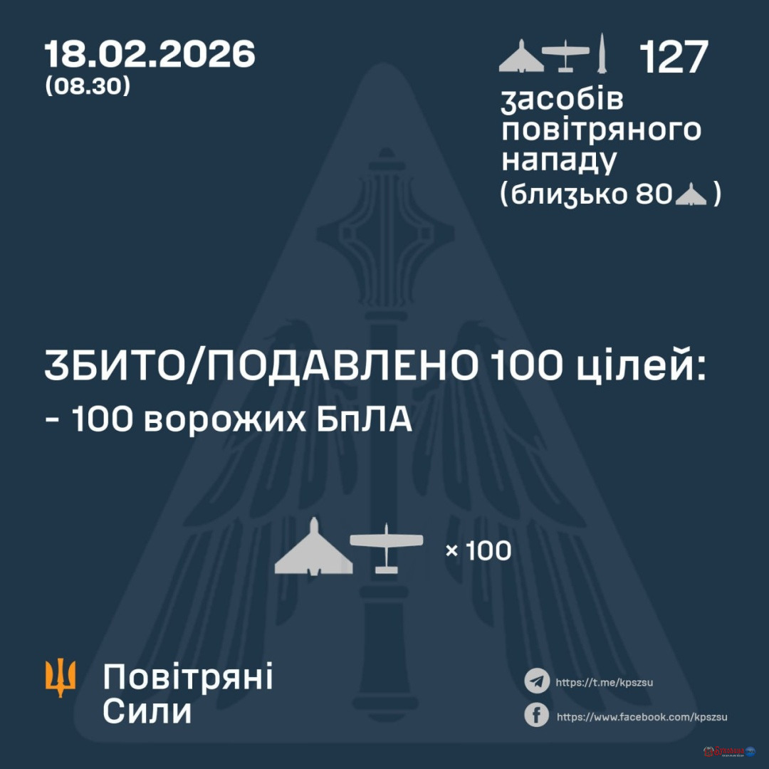 За попередніми даними, станом на 08:30 середи, 18 лютого, ППО збила / подавила 100 ворожих безпілотників на півночі, півдні та сході країни.