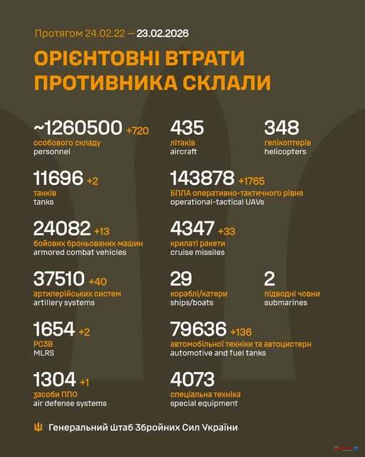 Ми зібрали для вас інформацію про тисяча чотириста шістдесят перший день Великої війни: чим жили Україна та українці 23 лютого 2026 року.