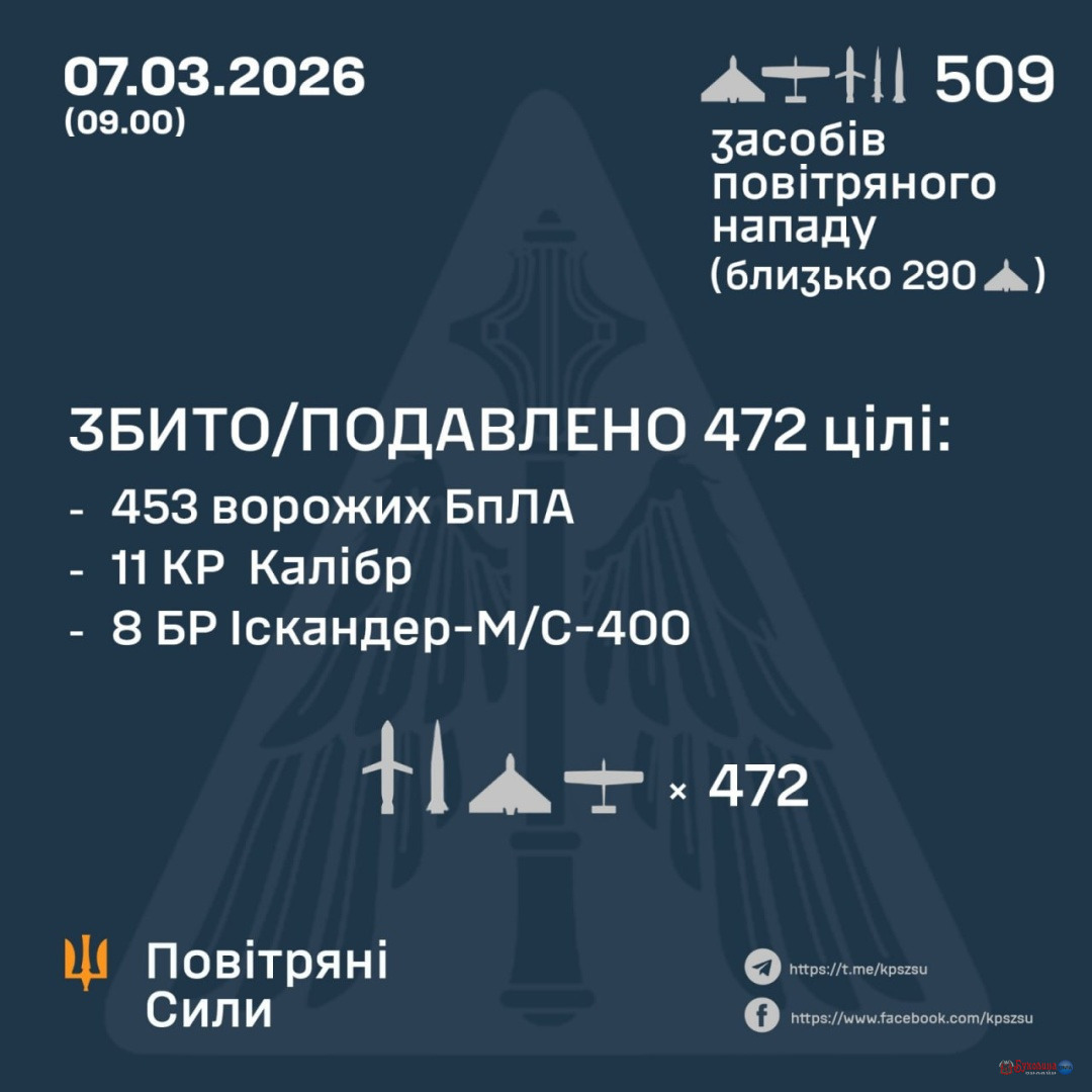 За попередніми даними, станом на 09:00 суботи, 7 березня, ППО збила / подавила 472 цілі – 19 ракет та 453 безпілотники різних типів: