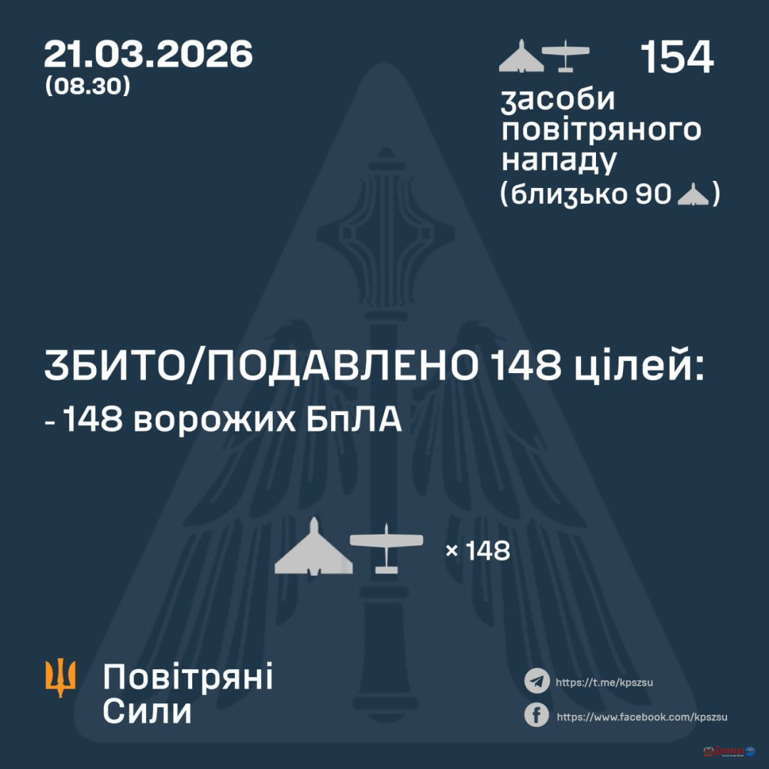 За попередніми даними, станом на 08:30 суботи, 21 березня, ППО збила / подавила 148 дронів.