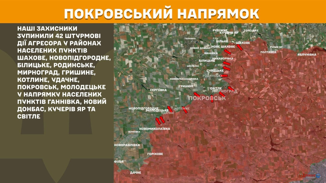 На Покровському напрямку наші захисники зупинили 42 штурмові дії агресора у районах населених пунктів Шахове, Новопідгородне, Білицьке, Родинське, Мирноград, Гришине, Котлине, Удачне, Покровськ, Молодецьке у напрямку населених пунктів Ганнівка, Новий Донбас, Кучерів Яр та Світле.