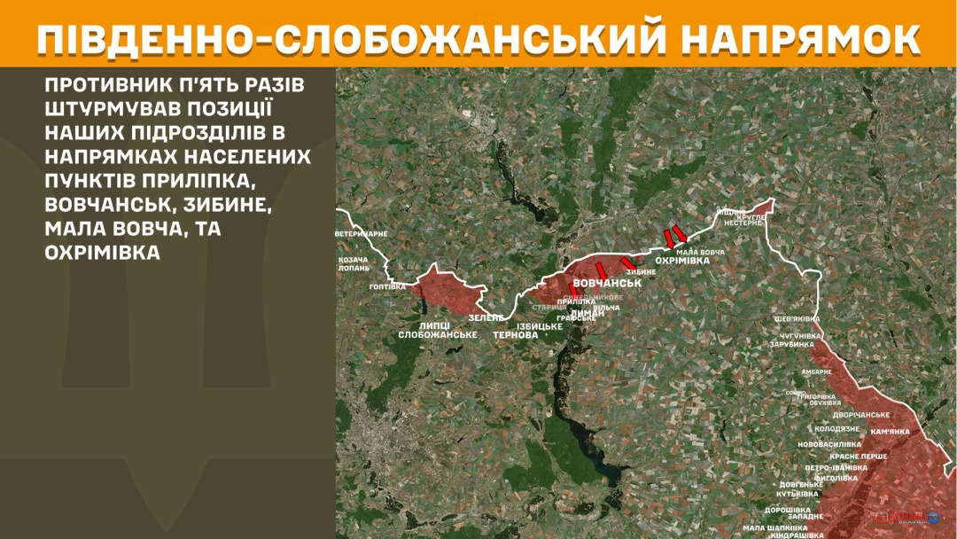 На Південно-Слобожанському напрямку загарбники штурмували п’ять разів у напрямках Приліпки, Вовчанська, Зибиного, Малої Вовчої та Охрімівки.