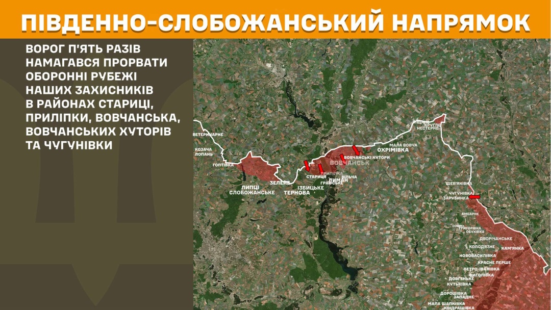 На Південно–Слобожанському напрямку ворог п’ять разів намагався прорвати оборонні рубежі українських захисників в районах Стариці, Приліпки, Вовчанська, Вовчанських Хуторів та Чугунівки.
