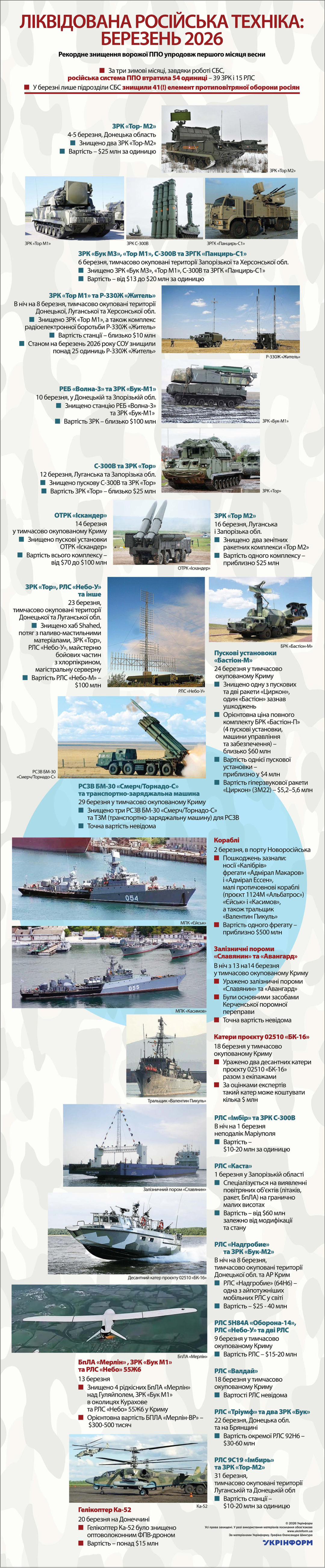 Ліквідована російська техніка: березень 2026 14.04.2026 12:01 Укрінформ Рекордне знищення ворожої ППО упродовж першого місяця весни За інформацією Укрінформу Новини з передової