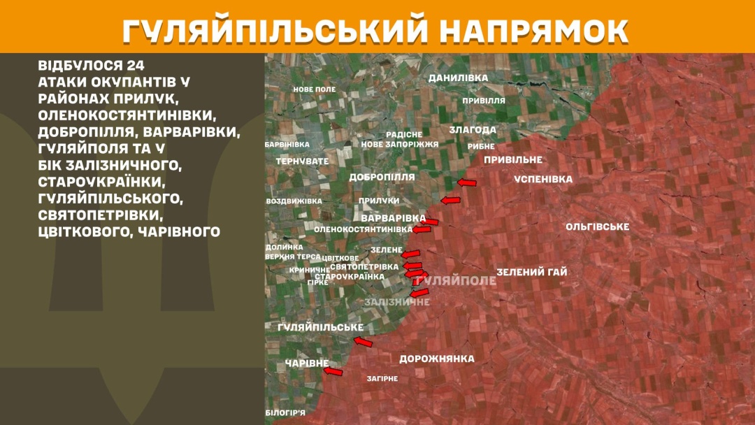 На Гуляйпільському напрямку відбулися 24 атаки російських військових у районах Прилук, Оленокостянтинівки, Добропілля, Варварівки, Гуляйполя та у бік Залізничного, Староукраїнки, Гуляйпільського, Святопетрівки, Цвіткового, Чарівного.